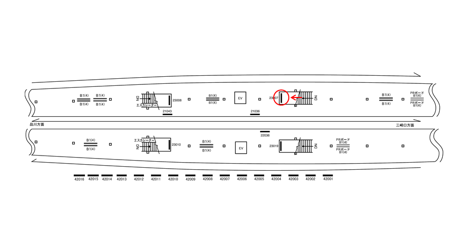 駅看板「京急 京急久里浜駅 №23007」は京急線下りホームの階段正面にあります。横浜方面から京急久里浜駅にて下車された方が駅出口へ向かう際にも見てもらえる位置です。