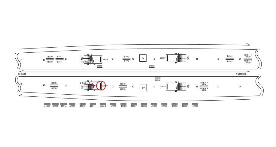 駅看板「京急 京急久里浜駅 №23010」は京急線上りホームの階段正面にあります。下り方面から京急久里浜駅で降りた方が駅出口へ向かう際にも見てもらえる位置です。