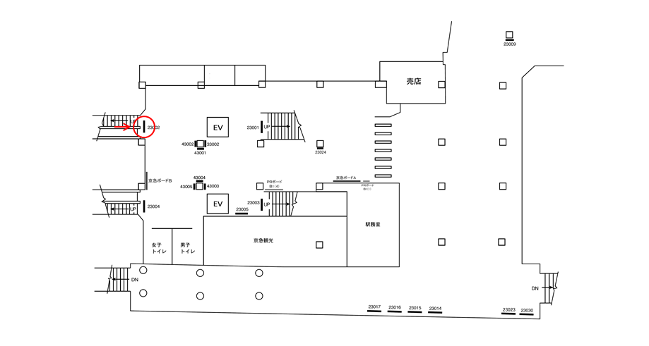 駅看板「京急 京急久里浜駅 №23002」はホーム階段の正面にあります。これから駅を出る方に見てもらえます。移動中に見てもらえる駅構内の駅看板は、京急久里浜駅の周辺にある店舗施設の紹介や道案内に利用されています。特に駅の出口付近にある駅看板は、店舗までの距離が近く案内看板に適しています。