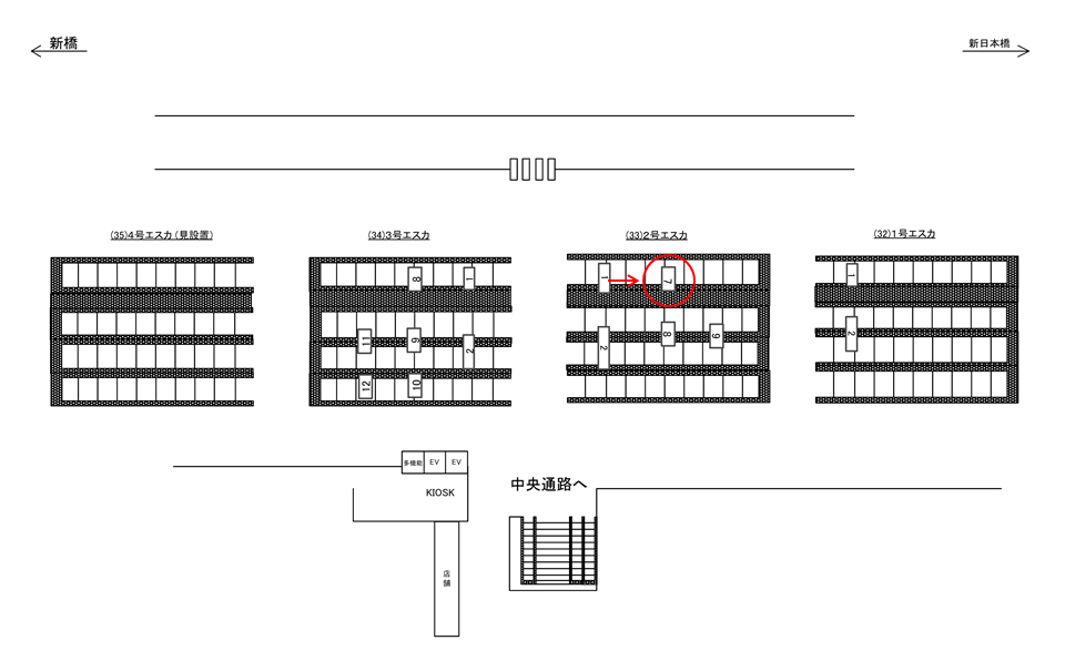 ○2号エスカ№3 改札内コンコース(ホームエスカレーター正面 横須賀線・総武線快速ホーム 丸の内地下中央口付近) |