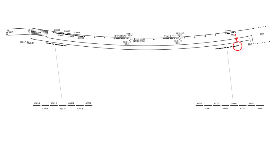 駅看板「京急 逗子・葉山駅 №43001」はホームの中でも南口改札側にあります。