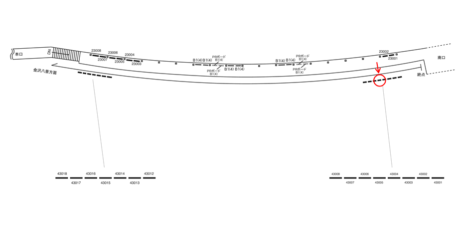 駅看板「京急 逗子・葉山駅 №43005」はホームの中でも南口改札側にあります。
