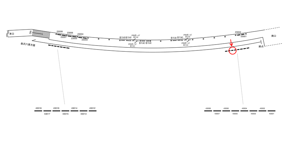 駅看板「京急 逗子・葉山駅 №43006」はホームの中でも南口改札側にあります。