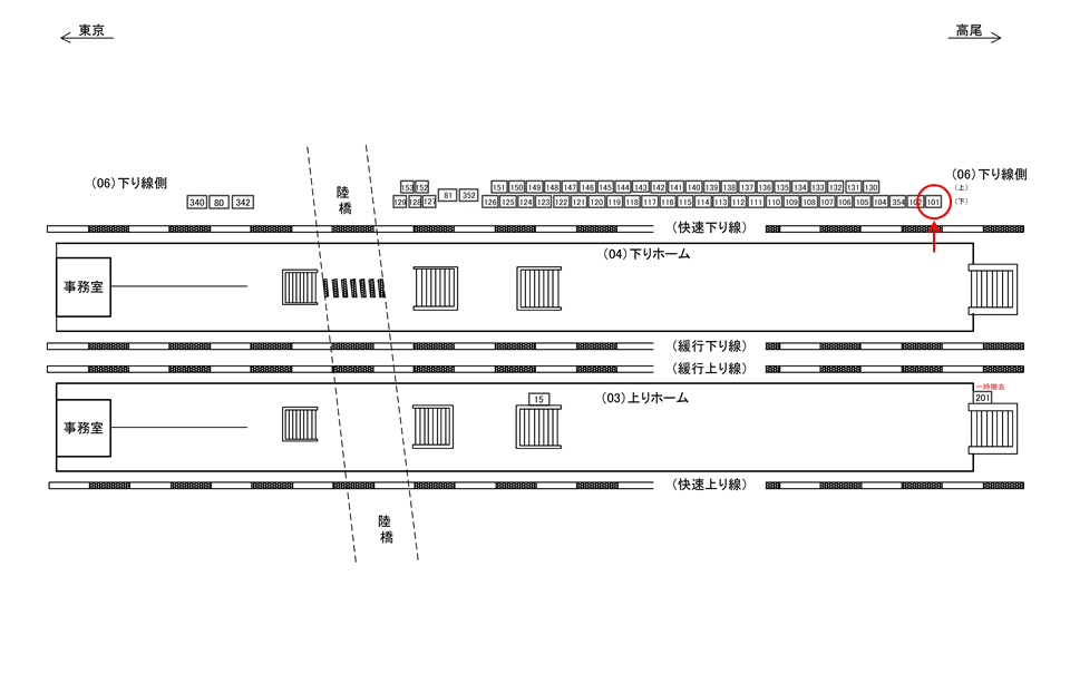 ○下り線側№107 線路前(JR中央線快速 新宿・立川・八王子・高尾方面) |