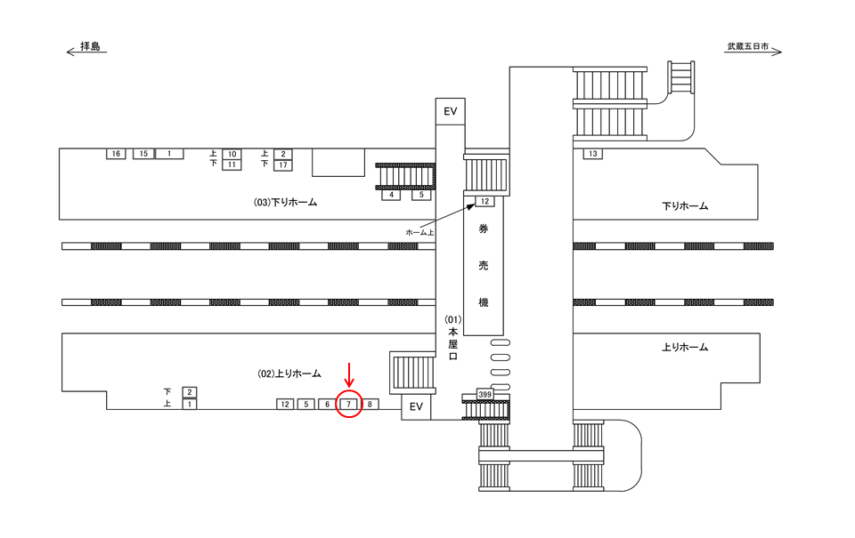 ※この看板「JR 秋川駅 上りホーム№2」は看板位置が高いところにあり、立川方面へ向かう方には見えづらい看板位置となりますのでご注意ください。