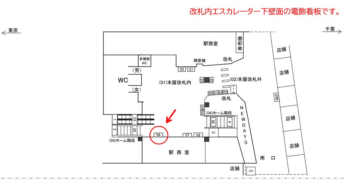 改札階とホーム階を繋ぐエスカレーターの横に位置しております。高い位置にある電飾看板は混雑時や夜間など、どのようなシーンでも視認性に影響が出にくいのが特徴です。