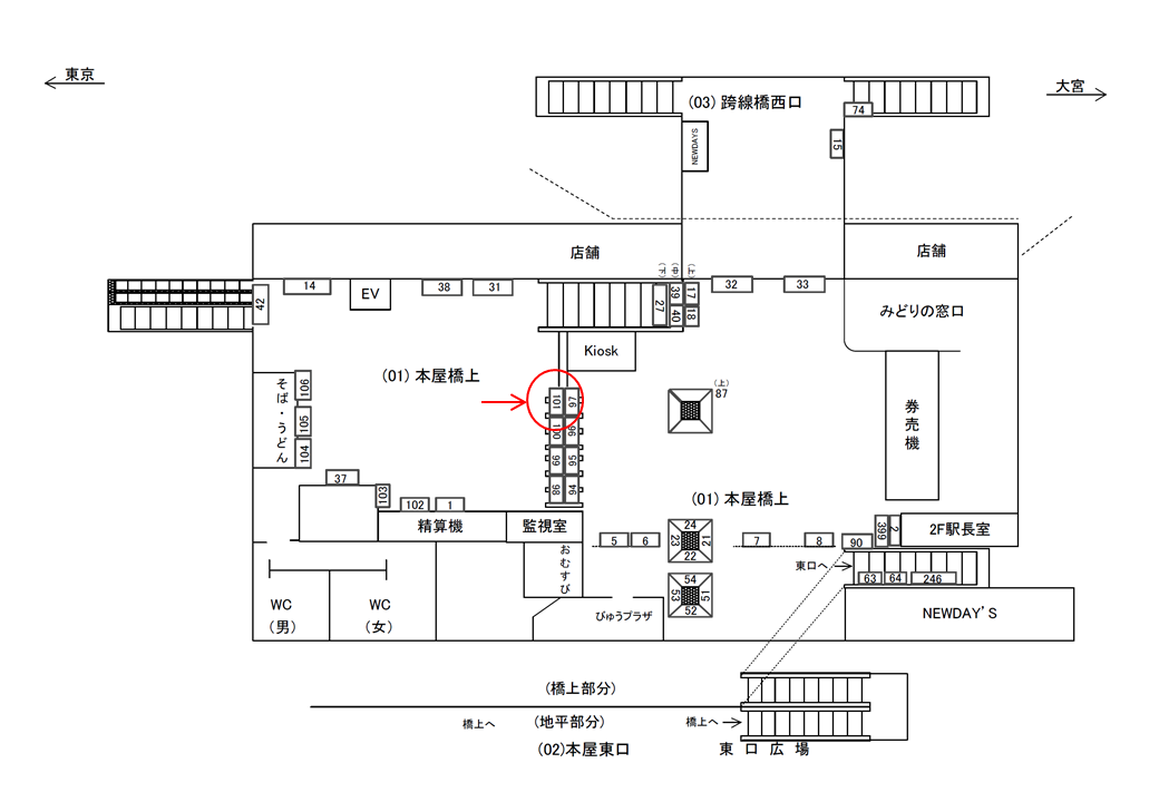 改札は橋上の駅舎に1箇所、ホームは下層地上階に京浜東北線ホーム1面(島ホーム)がございます。