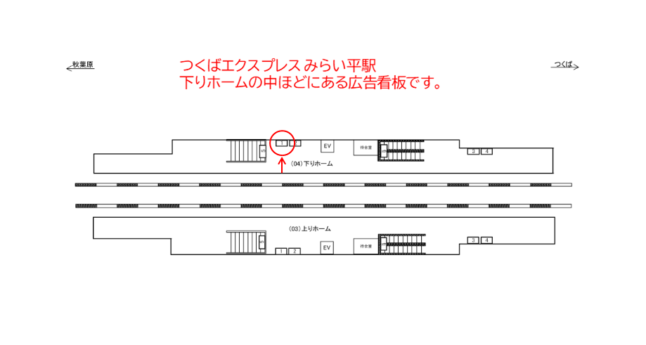 駅看板「つくばエクスプレス みらい平駅 下りホーム№1」はつくばエクスプレス みらい平駅のつくば方面ホームにある駅看板広告です。