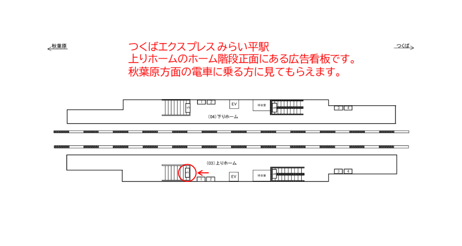 駅看板「つくばエクスプレス みらい平駅 上りホーム№5」はつくばエクスプレス みらい平駅の上りホームの階段正面にある駅看板広告です。