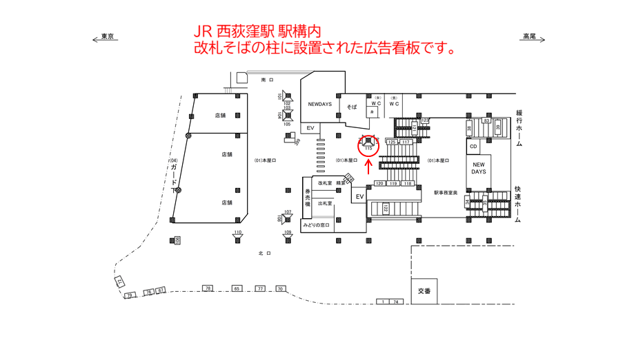 駅看板「JR 西荻窪駅 本屋口№115」はJR西荻窪駅の駅構内の柱面に設置された駅看板広告です。