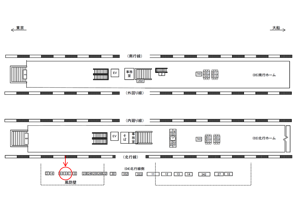 ○北行線側№6 線路前(JR京浜東北線 新橋・東京・上野・大宮方面) |