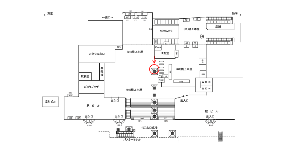 駅看板「JR 平塚駅 橋上本屋口№95」はメイン改札(東改札口)のそばにある柱面に設置された広告看板です。南口側から改札や北口方面へ向かう際に視界に入る柱面です。