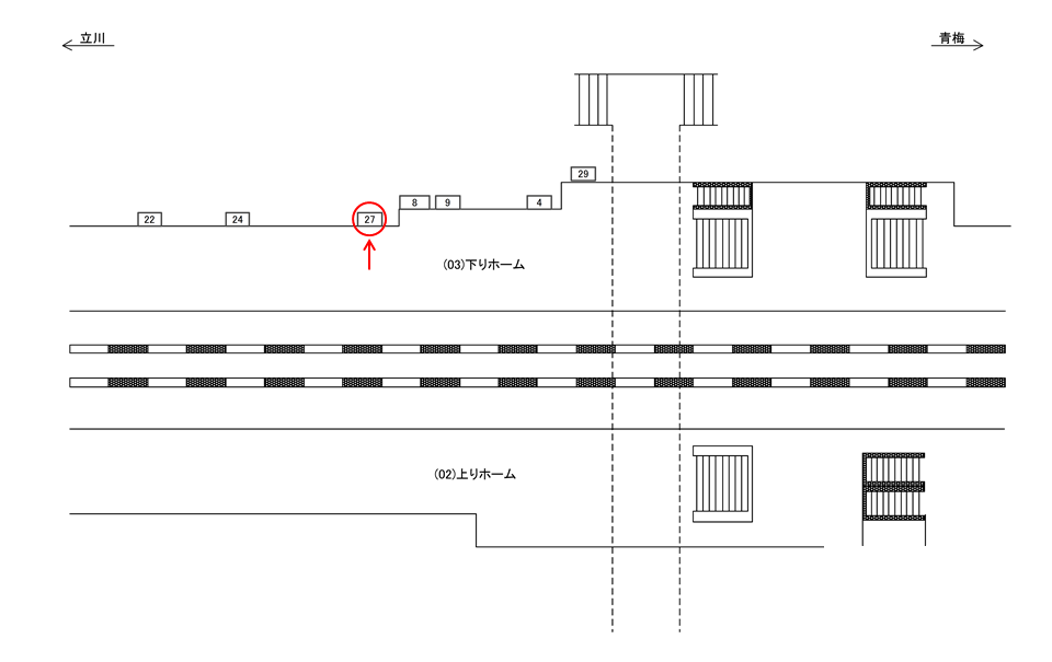 青梅線下りホームに設置された建植タイプの広告看板です。線路を挟む方になりますが、立川・東京方面への上り電車を待つ方に正面に見せられる立地です。主な広告接触タイミングとして、朝の都内方面へ通勤通学される方の電車待ちの際などにご覧いただけます。
