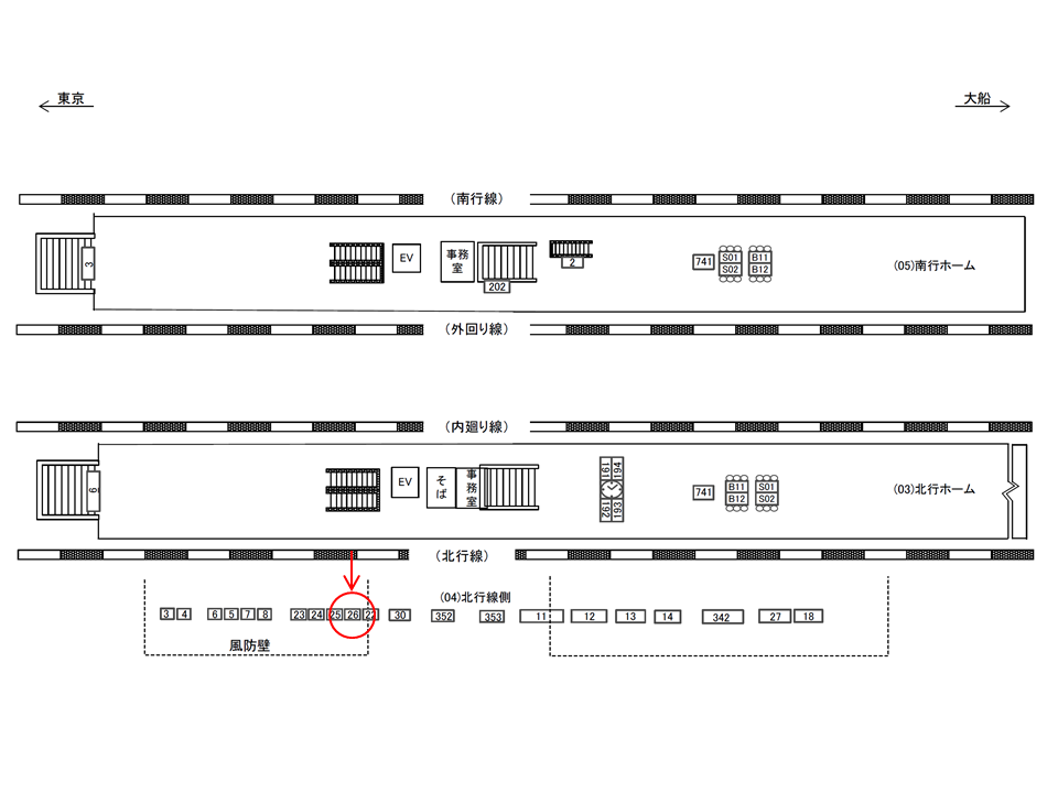 ○北行線側№24 線路前(JR京浜東北線 新橋・東京・上野・大宮方面) |