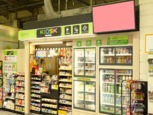 駅敷地内にあるNewDays(駅内コンビニエンスストア)の壁面に設置された横型ディスプレイ広告です。駅の中では珍しい音声を出せる広告ですので、NewDays付近を通行する方から注目を集めやすい映像広告です。