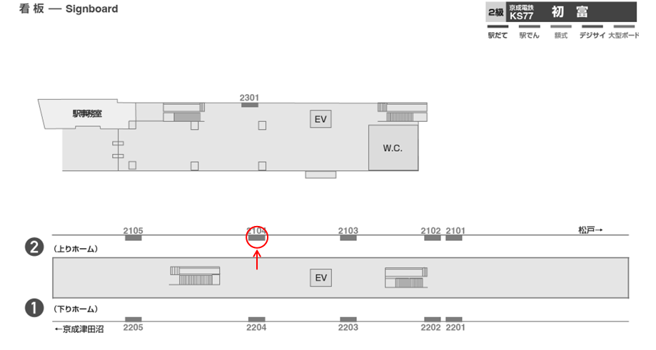 上りホーム(新鎌ヶ谷・松戸方面)前の壁面に設置された看板です。