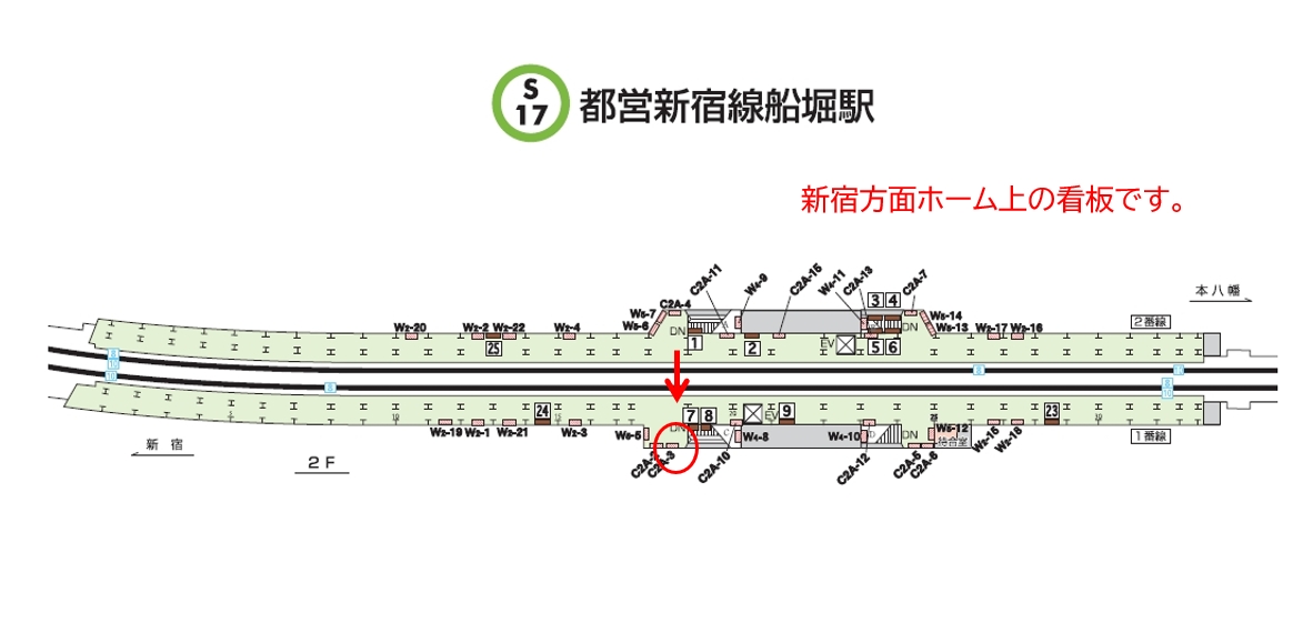 馬喰横山・新宿・京王線方面への利用者はもちろん、反対ホームからや停車中の車窓からも見える位置にございます。