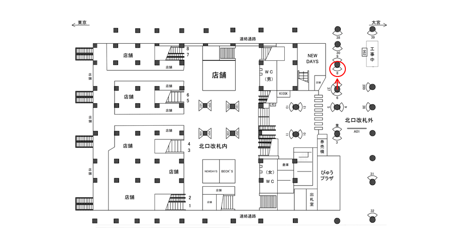 改札は北改札口と南改札口の地上2箇所、ホームは高架上層階に島ホーム4面(京浜東北線上下/宇都宮線・高崎線・上野東京ライン/宇都宮線・高崎線・湘南新宿ライン/埼京線の各ホーム)ございます。北口改札外は東西に抜けており、バス利用者や駅周辺を行き交う方々の自由通路としても機能しています。