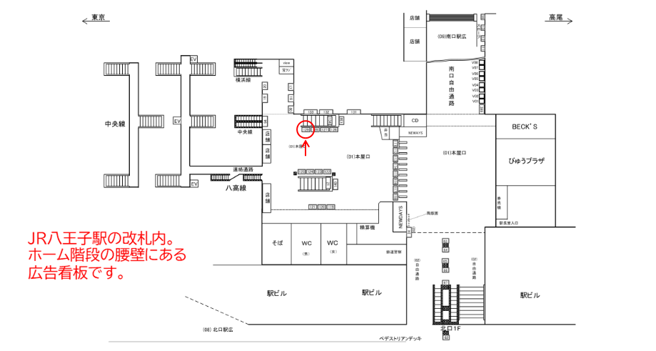 主に改札口から中央線下りホームや横浜線ホームへ向かう際、視界に入る場所にあります。改札からホームへ向かう際、自然に視界に入る事で無意識に広告情報を取り込んでもらう事ができます。