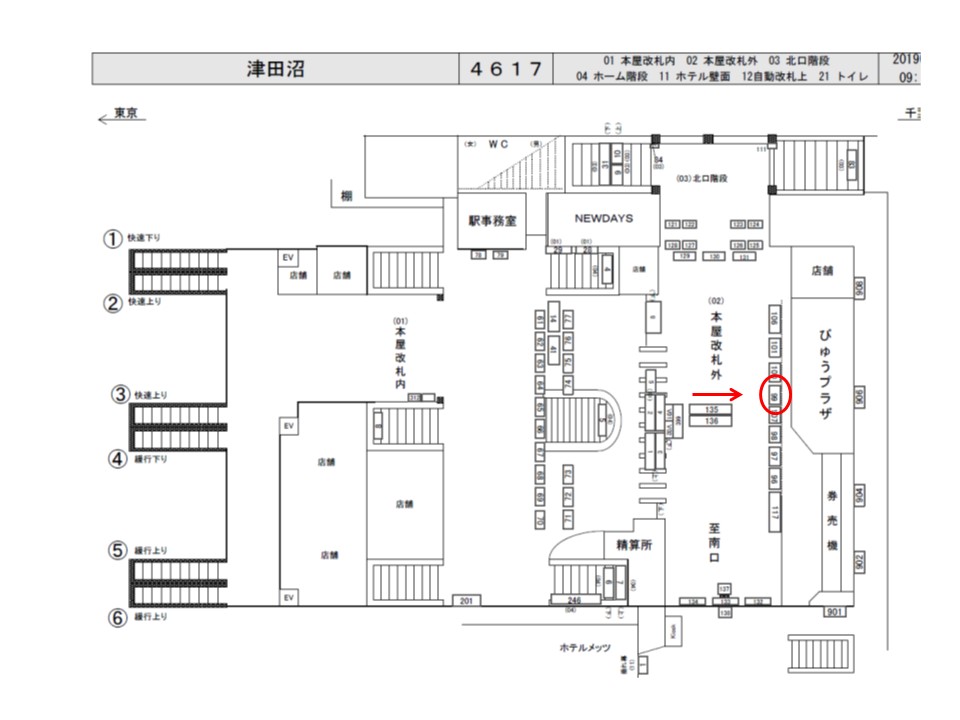 JR津田沼駅の改札外に設置されている電飾の看板です。こちらは自動改札正面に設置されており、改札を出る際に見えますので誘導看板に最適です。