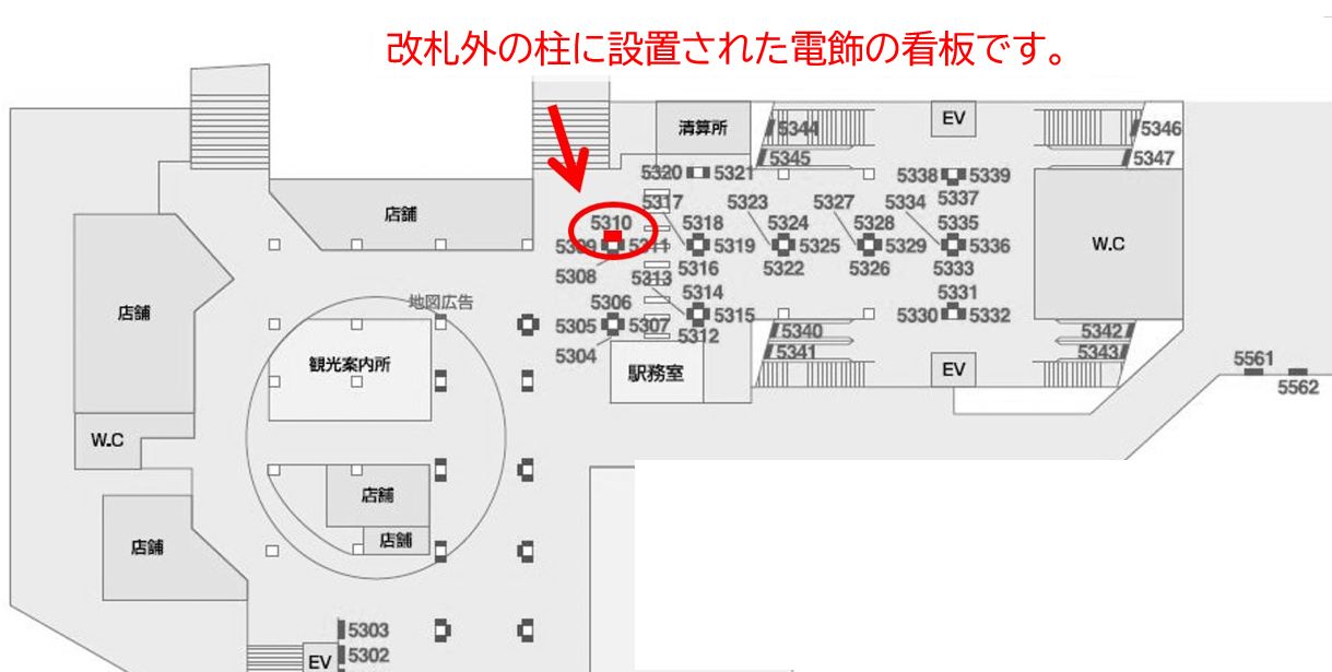 改札手前の柱の側面に設置された電飾タイプの看板です。