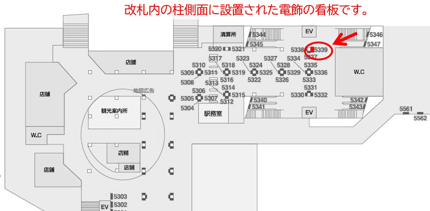 改札内の柱側面に設置された№5339の看板は、主に3.4番線に停車した車両から下車した方へ対して、広告との接触が期待できます。
