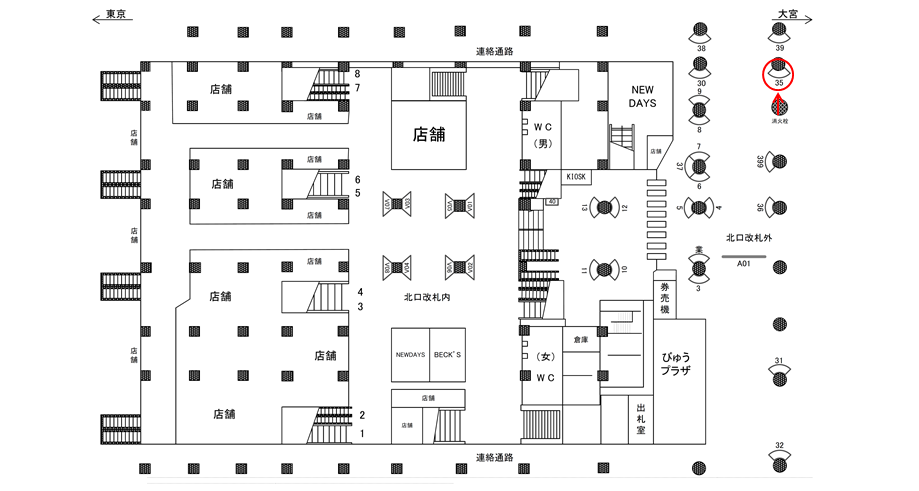 改札は北改札口と南改札口の地上2箇所、ホームは高架上層階に島ホーム4面(京浜東北線上下/宇都宮線・高崎線・上野東京ライン/宇都宮線・高崎線・湘南新宿ライン/埼京線の各ホーム)ございます。北口改札外は東西に抜けており、バス利用者や駅周辺を行き交う方々の自由通路としても機能しています。