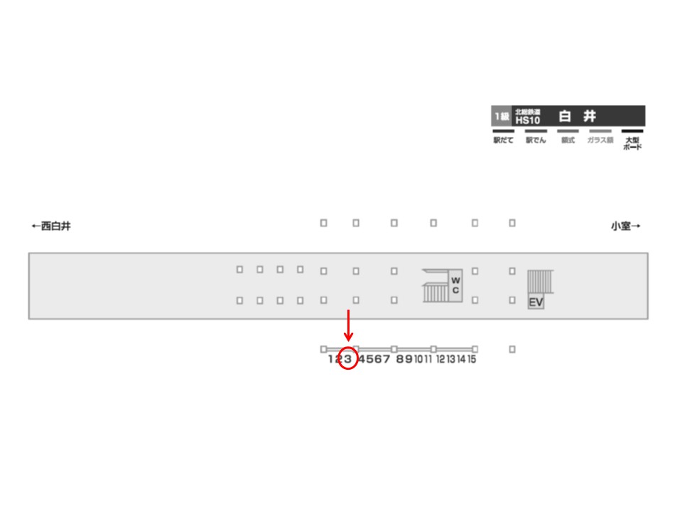 北総線白井駅の上りホーム(新鎌ヶ谷・京成高砂・都営浅草線・京急線方面行き)の線路前の看板です。上りホームで電車を待つ方に見せる事が可能です。