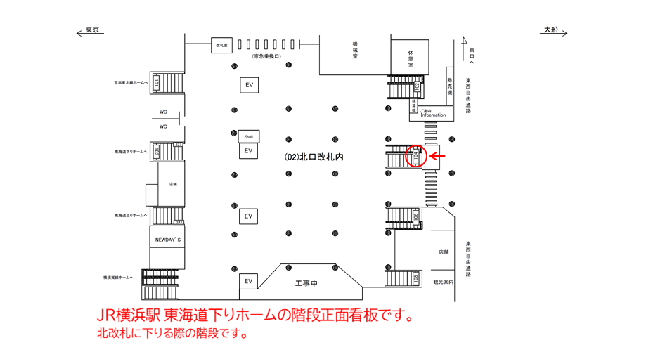 東海道線下りホームからきた通路側の北改札へ向かう際に利用する階段の正面についています。この看板は電飾タイプです。