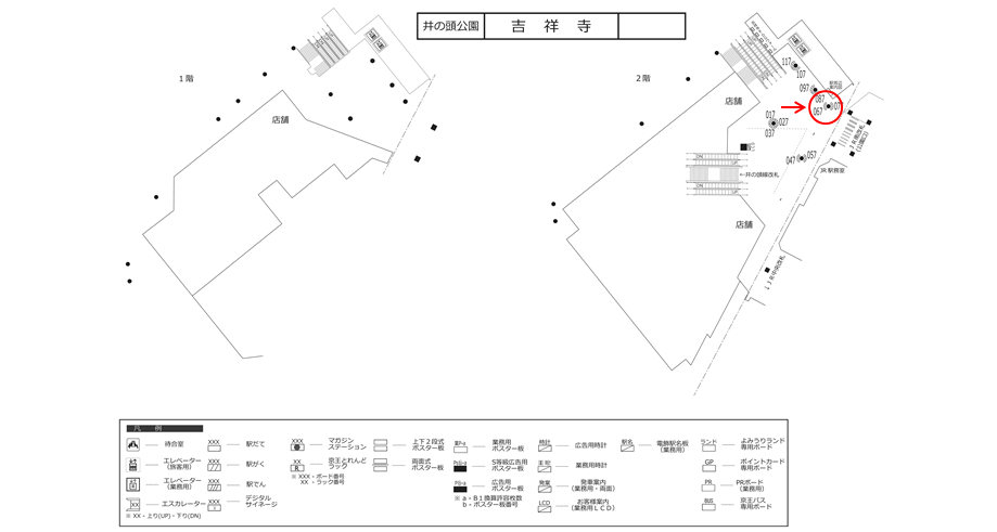 駅構内にある駅看板は「これから電車に乗る方」もしくは「駅を出る方」に見てもらえます。いずれにしても駅を利用するタイミングで広告に接触します。移動中に見てもらえる駅構内の駅看板は、京王井の頭線 吉祥寺駅の周辺にある店舗施設の紹介や道案内に利用されています。