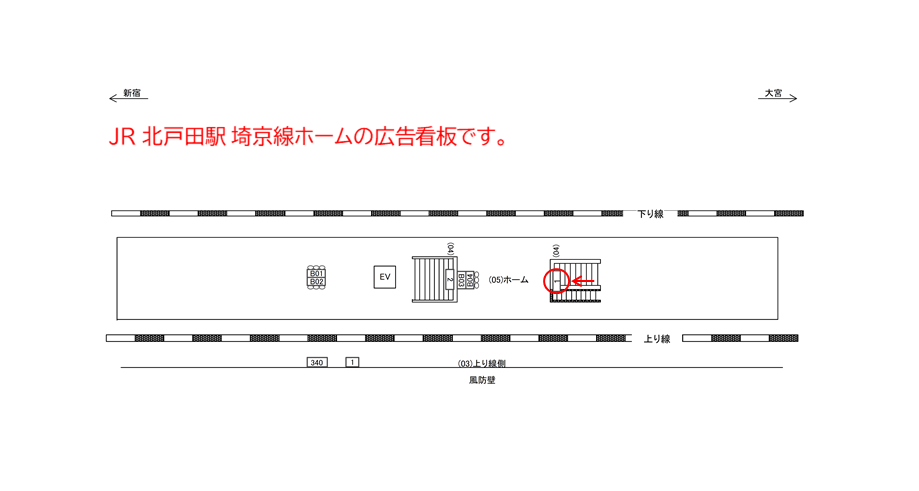 JR北戸田駅、埼京線ホーム階段上にある広告看板です。主にホームからコンコースへ向かう方々にご覧頂けます。