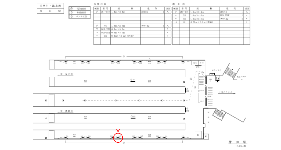 東急 多摩川線 蒲田駅、ホーム上の駅広告(駅看板)設備のご紹介です。