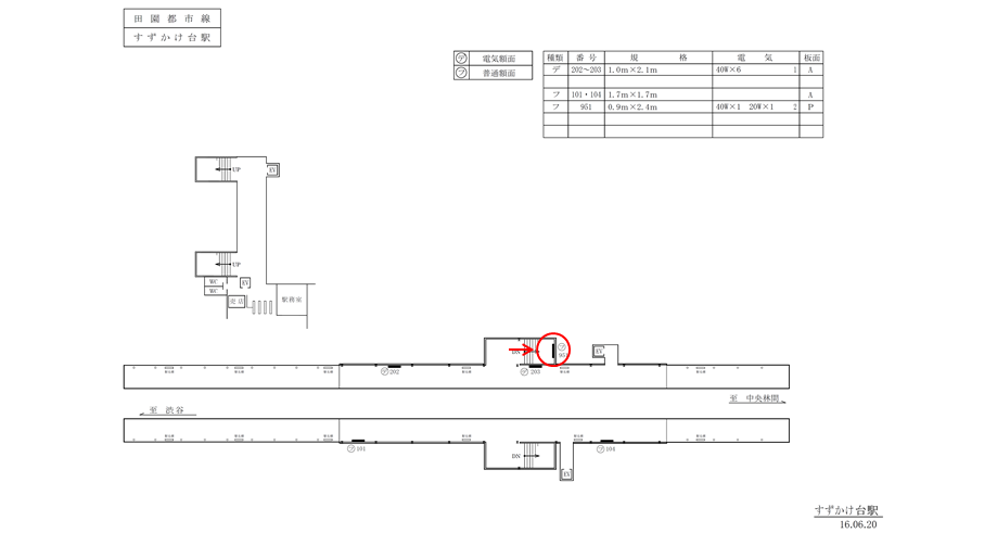 東急 田園都市線 すずかけ台駅、東急田園都市線ホーム(中央林間方面行き)から改札階へと向かう階段正面にある駅看板です。