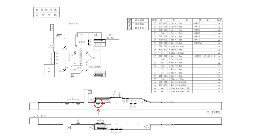 「東急 田園都市線 宮崎台駅 電気額面№208」は、ホームの頭上から吊り下げる形で設置されている広告看板です。ホーム中ほどにございます。