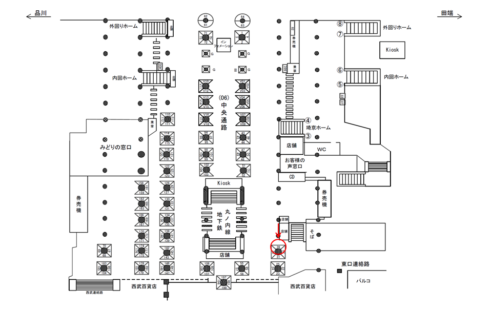○東口№20 改札外コンコース(階段横 北通路 東口方面) |