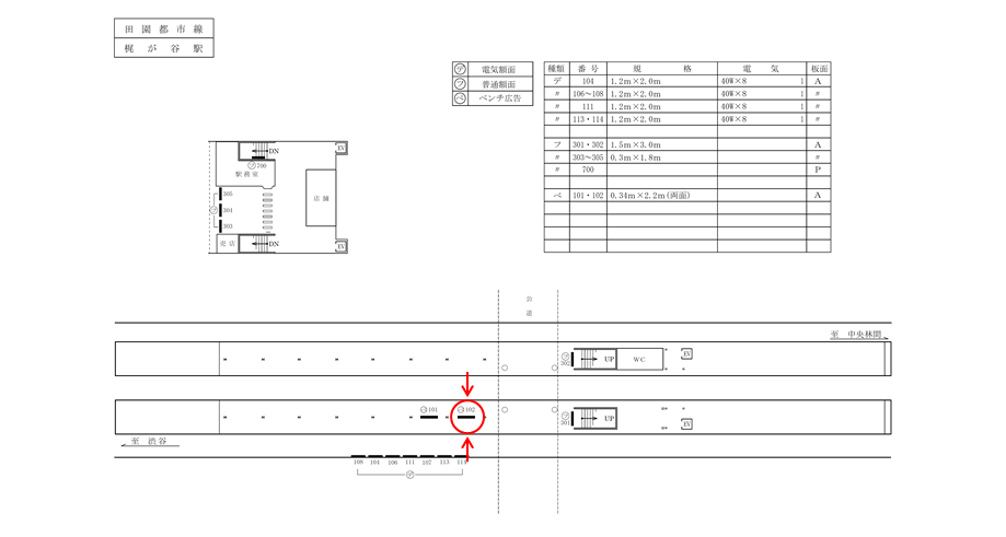 「東急 田園都市線 梶が谷駅 ベンチ広告№102」は、ホーム上にあるベンチに設置された広告看板です。