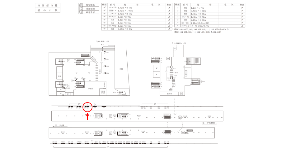 「東急 田園都市線 溝の口駅 電気額面№211」は、線路前に設置された広告看板です。またこちらの広告看板は、正面口(東口・西口)方面へ繋がる階段近くにあります。