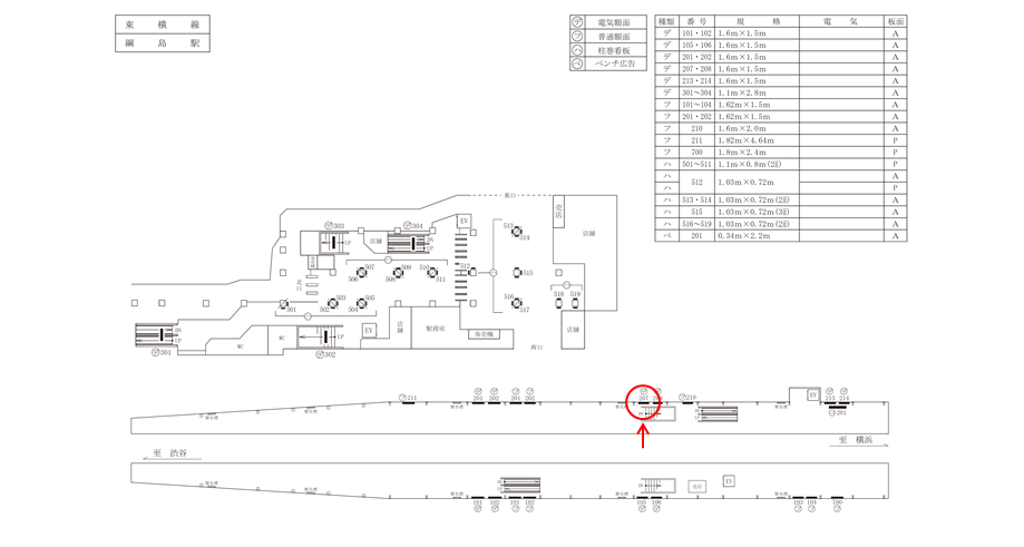 「東急 東横線 綱島駅 電気額面№207」は横浜方面ホーム上、出口へ繋がる階段横に設置された広告看板です。横浜方面ホームで下車し出口へ向かう方に特にご覧いただけます。