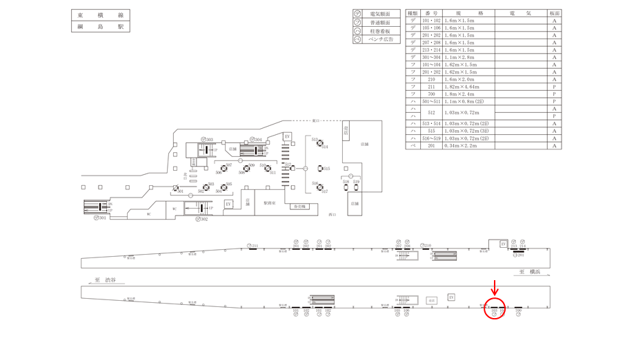 「東急 東横線 綱島駅 普通額面№103」は、渋谷方面ホームの壁面に設置された広告看板です。渋谷方面の電車を待つ方やホーム上を移動する方にご覧いただけます。