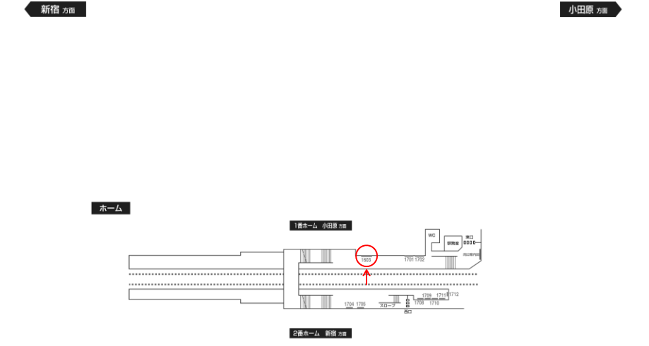 改札は二箇所、上りホーム側の西口改札口と下りホーム側の東口改札口があります。ホームは小田急線の上り下りの各ホームが向き合う相対式です。