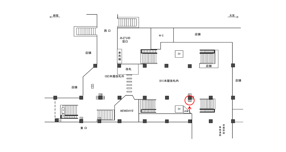 ○本屋改札外№14 改札外コンコース(階段正面/東口方面) |