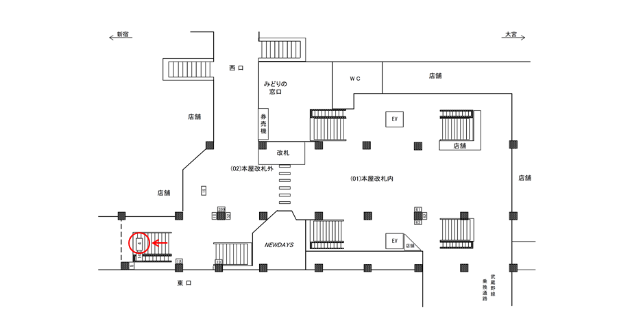 ○本屋改札外№14 改札外コンコース(階段正面/東口方面) |
