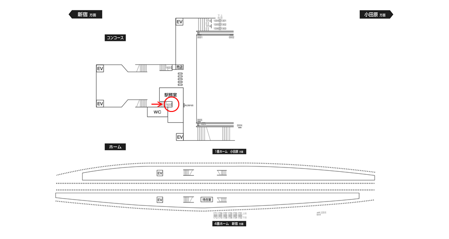 改札は橋上改札一か所、ホームは小田急線の上り下りの各ホームからなる4線2島のホームです。