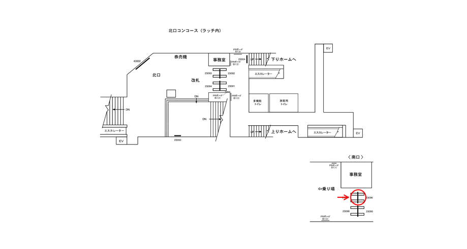 駅構内にあるこの駅看板は「駅を出る方」に見てもらえます。いずれにしても駅を利用するタイミングで広告に接触します。移動中に見てもらえる駅構内の駅看板は、新馬場駅の周辺にある店舗施設の紹介や道案内に利用されています。特に駅の出口付近にある駅看板は、店舗までの距離が近く案内看板に適しています。