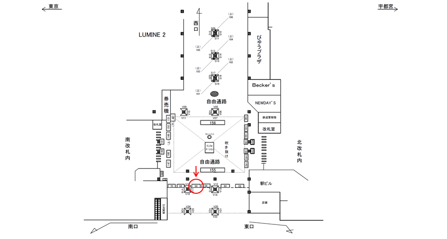 ○東口通路№188 改札外コンコース(東口中央出口 階段正面) |