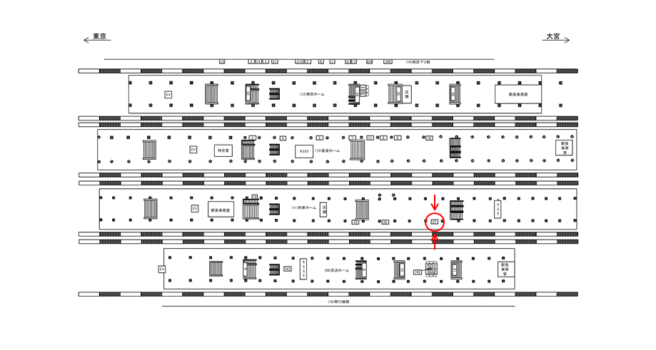 改札は北改札口と南改札口の地上2箇所、ホームは高架上層階に島ホーム4面(京浜東北線上下/宇都宮線・高崎線・上野東京ライン/宇都宮線・高崎線・湘南新宿ライン/埼京線の各ホーム)ございます。北口改札外は東西に抜けており、バス利用者や駅周辺を行き交う方々の自由通路としても機能しています。