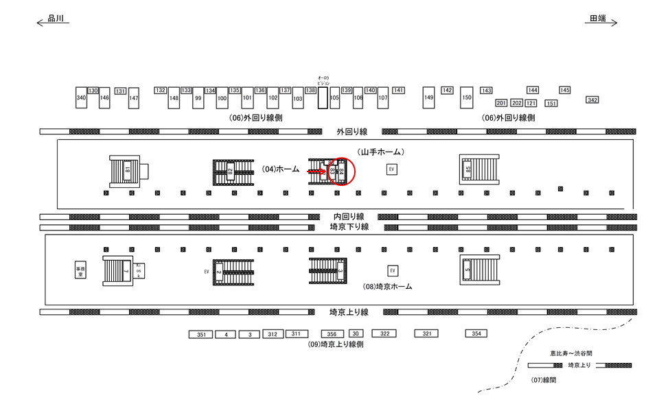 ○ホーム№81 ホーム上(階段正面 JR山手線ホーム 東口側改札寄り) |