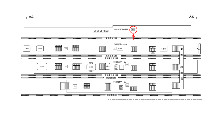 改札はメインとなる中央通路に面する中央南改札と中央北改札、北通路に面する北改札の計3箇所。ホームは東海道線ホーム、京浜東北線ホーム、南武線ホームの3面で、それぞれのホームに上下線が発着します。東口から京急川崎駅まで200mほど。