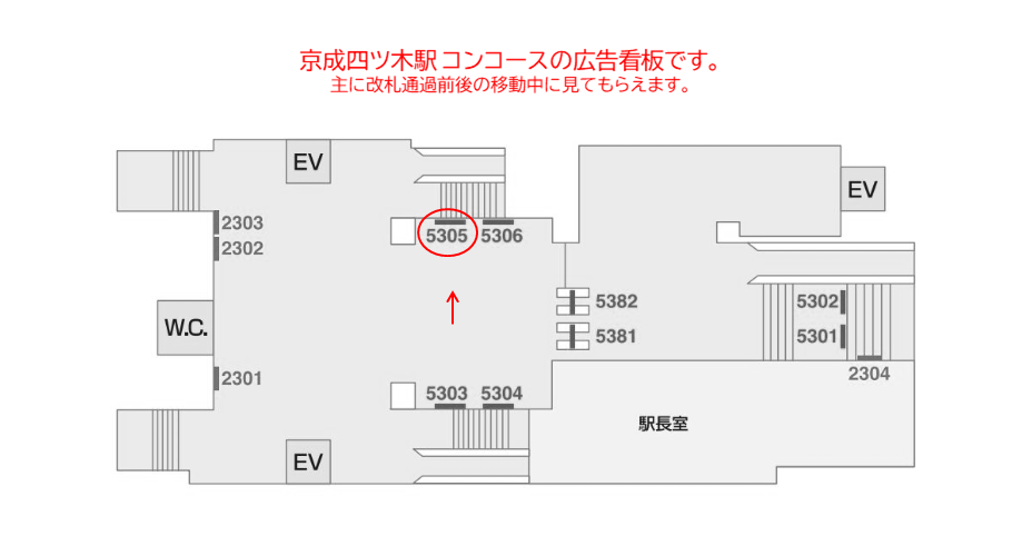 改札内右手のやや高めの位置にある内照式タイプの電飾看板で、改札通過前後のタイミングで広告との接触が期待できます。