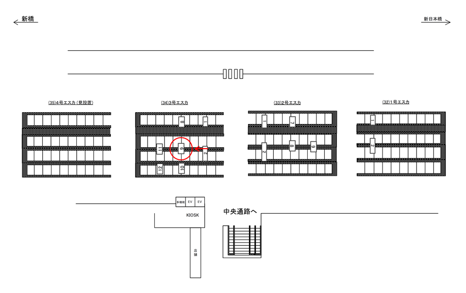 ○2号エスカ№3 改札内コンコース(ホームエスカレーター正面 横須賀線・総武線快速ホーム 丸の内地下中央口付近) |
